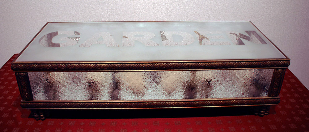 Poplar, marisco & sandblasted glass, mirror, slip-cast clay objects, mitered damask
